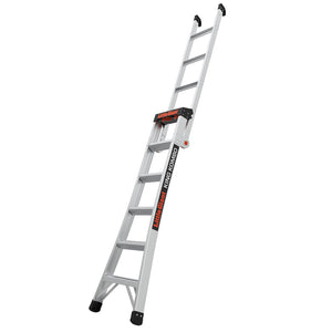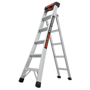 With a one year warranty, the Aluminum combination ladder is built for intensive use. When in an extended position the heavy-duty grip easily conforms to corners offering protection against damageable surfaces such as paint and drywall. One of our favourite features on this Little Giant Combination Ladder is the ground cue. The ground cue is the visible strip on the bottom rung and when this is stepped on it gives an audible and tactile signal to let the user know you are on the last step, did you know a high percentage of ladder injuries are those falling from the last step? This all-access multi-purpose ladder, with its lightweight frame and heavy-duty feet, is the world's first stepladder, extension, and lean-to ladder all in one. Little Giant's King Kombo ladder is built for getting stuff done!