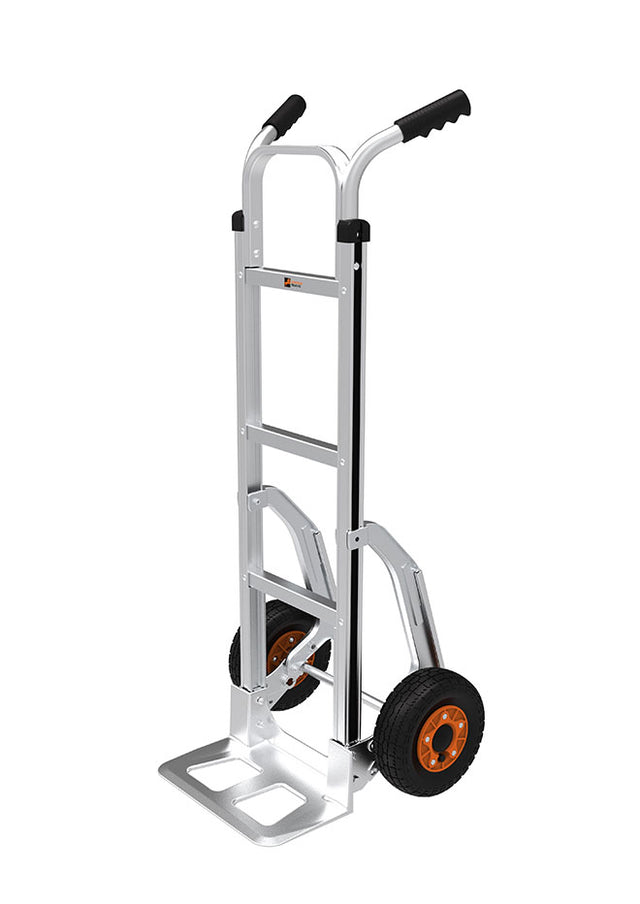 The G1824P Centaur Sack Truck is manufacured in aluminium giving the product lightweight yet robust qualities. This sack truck is ideal for industrial and heavy duty applications as it allows a 200 kg capacity. The frame of the Centaur high back sack truck is flat to give extra stability and the 250 mm REACH complient wheels give extra stability when moving the sack truck on uneven ground and rough terrain. This model comes with sliders to assist when moving items up steps, these sliders can also be easily removed should this be required.