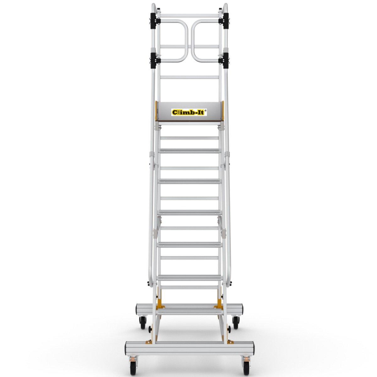 The Climb It Mobile Safety Steps are a unique piece of working at height equipment and offer the height of a warehouse step with the benefits of an enclosed platform. This range of mobile safety steps are manufactured with an anti-slip platform with a generous 600 x 500 mm working area. With wide profile treads and a maximum load of 150kg, this 8 tread aluminium warehouse step has double handrails and a spring platform gate for added security to the user.