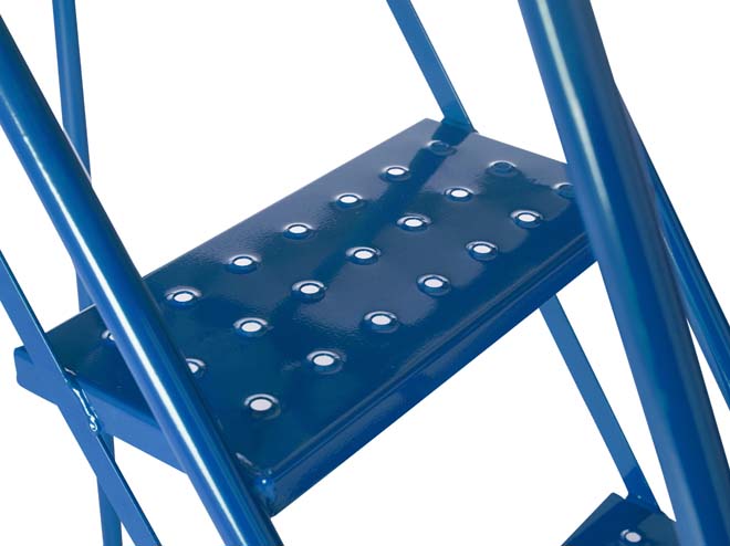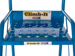 The Climb-It mobile warehouse steps are manufactured in the UK from a strong tubular steel. The 3 tread Climb-It mobile steps come with domed feet with spring loaded castors, the castors on this range of mobile steps engage or disengage when weight is applied. With a solid steel construction and a large tread size of 180 x 380 mm and a load capacity of 150kg these domed mobile steps are available in blue or red with punched or anti-slip treads at no extra cost.