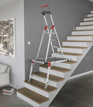 The TP1 can be used as a working platform alone which can be safely stood on to reach those areas that are difficult to reach alone. If still required to gain a little extra height this stair platform can be used with any of the Hailo Step Stools or Step Ladders. (Up to a maximum of 4 treads). The non-slip working surface integrated into a sturdy aluminium frame system offers a firm footing. This versatile product comes pre-assembled for immediate use, both inside and outside the home. This platform can be used on the majority of straight and spiral stairs and has a two-hand safety unlocking mechanism.