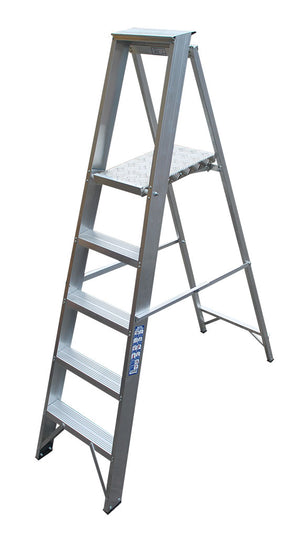 Industrial strength Class 1 Platform Stepladders kitemarked with a 175 kg maximum load. Strong, safe and easy to transport and use This range of heavy duty stepladders feature 80mm deep treads with a deeply ribbed non-slip surface. Each tread is double rivited for extra rigidity. Front and rear stays on the bottom tread increase the robustness of the ladder and locking side trays allow for positive overcentre locking in the open position. The ladders come with non-slip rubber feet fitted on the front and rear legs and a tread plate working platform 430 x 250mm fitted with an automatic closing device. This industrial strength stepladder also comes with an Integrated tool tray above the platform to help store nuts, bolts and tools.