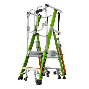 The newer 2.0 Safety Cage™ is mobile and lightweight compared to other enclosed platform options like scaffolds or powered lifts, so you can use it in areas like stages or interstitial levels where a mechanical lift or ordinary stepladder could never go. The Safety Cage™ allows operators to work handsfree in any direction in complete safety because, unlike platform stepladders, its “wrap-around” guardrail actually wraps around the operator completely in total compliance to tie-off rules. The Safety Cage™ helps protect operators from the most common causes of stepladder falls, including standing on the top cap and over-reaching. The Safety Cage™ stores in a compact footprint and is easy to store and transport. Time- and energy-saving Tip & Glide™ Wheels make it quick and easy to move from job to job.