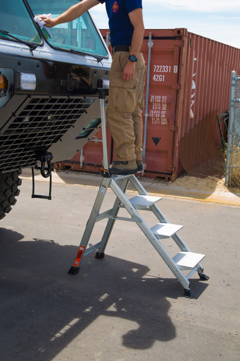 The Little Giant Jumbo Steps are certified to EN14183 and gives the user a generous step for climbing when accessing lower levels. With a lightweight construction and compact dimensions when folded it's perfect for storage or transportation. The Jumbo Step is the ultimate combination of lightweight, stability and high strength. The unique features of this step is the 21.5cm wide slip resistant staggered steps which are designed to be stair like, offering ultimate comfort and safety whilst working at height.