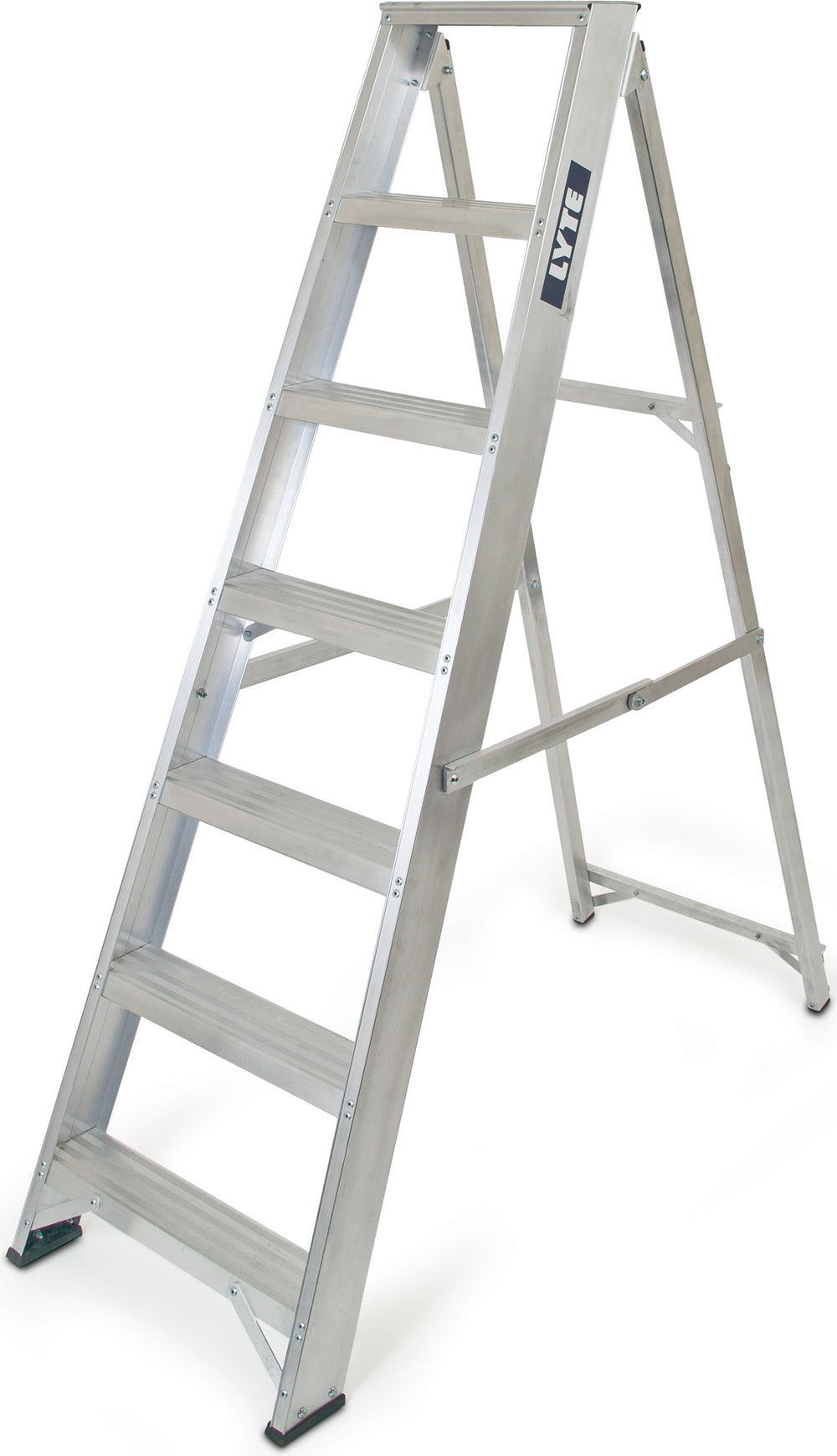 This range of Magnastep ladders from Lyte is ideal for trade use and is tested to a durability test of 50,000 cycles. Simple, safe and easy to transport and use, the Lyte NESS7M Swingback Stepladders feature a unique strengthening beam that is incorporated into the non-slip treads. Designed for professional and heavy duty use, this 7 tread step ladder has durable rubber feet and aluminium side arms prevent slips and twists with no tapes or flimsy arms to break.