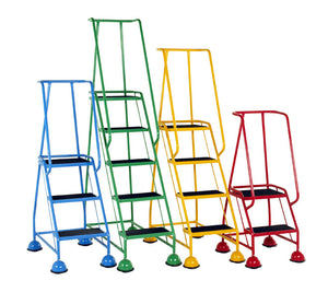 The Classic Warehouse Steps have a close fitting continuous single rail guard around top platform, extending down each side of stairway as a short handrail. The classic warehouse steps are available in a range of colours and has plunged feet which is preferred by a number of our customers as they tend to feel more secure. Manufactured in steel tube and welded to BS EN287 these warehouse steps are built with heavy duty use in.