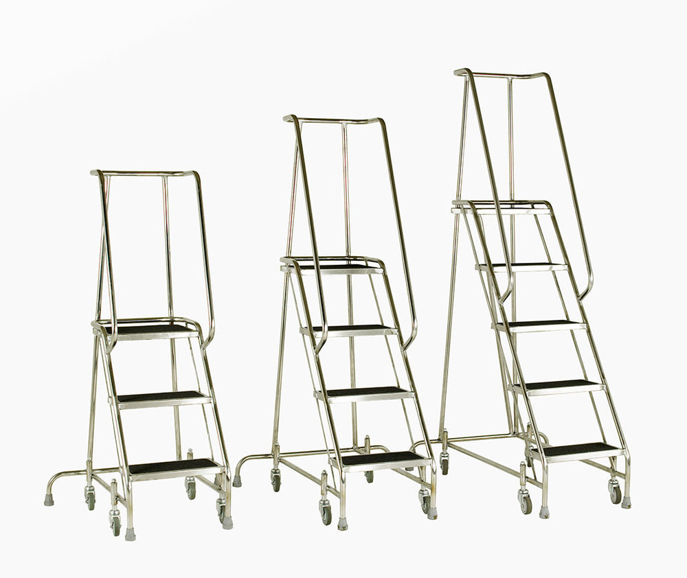 High quality range of mobile step units, manufactured from formed tube and sheet stainless steel of quality particularly suitable for food drink and chemical industries. Fully welded throughout for maximum rigidity.