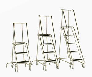 All step units fitted with 4 x 80 mm dia spring loaded castors with grey non marking rubber tyres fitted in heavy zinc plated housing which retract when weigh is applied to the steps, giving firm contact with the floor.