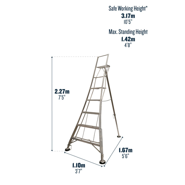 Designed with landscapers, agriculture and gardening enthusiasts alike. This 5 tread tripod ladder is constructed in lightweight aluminium and has three telescopic legs to make it adjustable to suit the task in hand. This tripod ladder is ideal to setup on slopes, steps, stairwells and rough uneven terrain. The 5 tread model of the Werner tripod ladder has a ten year guarantee and a safe working height of 3.17m.