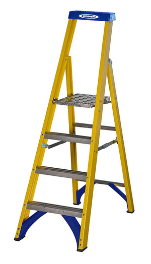 The 4 Tread Werner 717 Series is one of the best selling fibreglass platform step ladders. Manufactured with Fibreglass stiles that are non-conductive to 30,000 volts making them perfect for working in electrical environments. The 7170418 has a unique lock in system on the tool tray to make room for additional accessories such as the job bucket and paint holders to make working from height easier, without having to descend when a different tool is required. Heavy duty spreaders offer single handed operation and add to the strength and stability of this fibreglass platform step ladder.