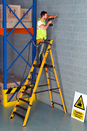 The Werner Megastep range features twin handrails for safety when climbing the ladder and has non-conductive fibreglass stiles for working around electricity. The extra large platform combined with a safety chain provides security and comfort. Suitable for trade use.