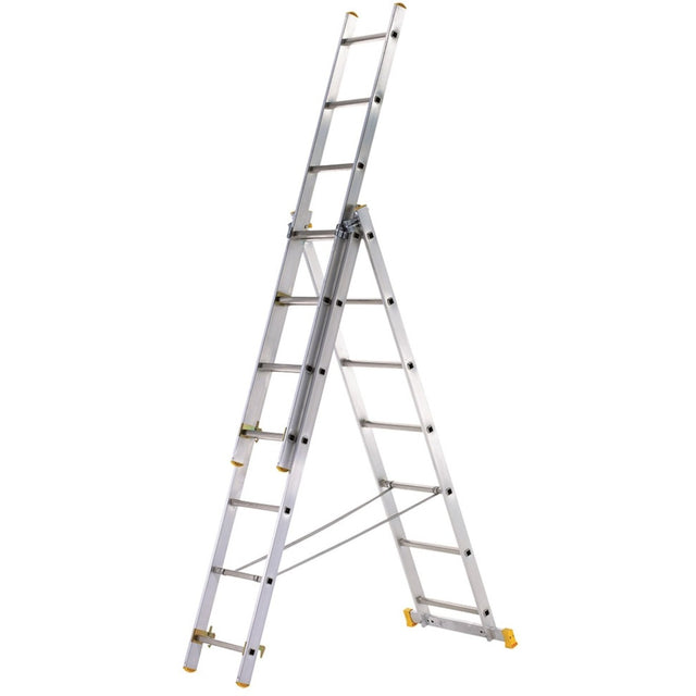 This Zarges 3 way combination ladder is certified to EN131 with a static load of 150kg. The Eurostar can be used for multiple purposes around the home and is also suitable for light trade. This particular range of combination ladders contains a hinge system to enable sections to be handled and positioned intuitively. As well as being used as a stepladder, free standing ladder and triple extension ladder, the upper section can be removed to use as a single section ladder if required.